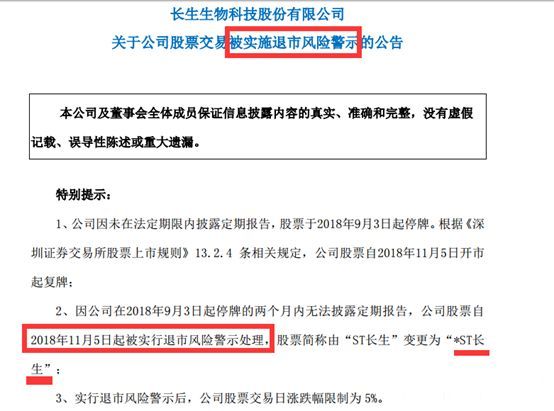 根據長生生物1日晚間的公告,因公司在2018年9月3日起停牌的兩個月內無法披露定期報告,公司股票自2018年11月5日起復牌,同時被實行退市風險警示處理,股票簡稱由“ST長生”變更為“*ST長生”。